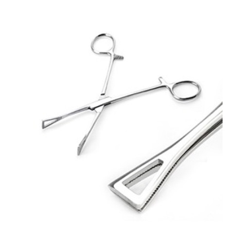 A Pennington clamp, also known as a Duval clamp, is a surgical clamp with a triangular eyelet. Used for grasping tissue, particularly during intestinal and rectal operations These Pennington forceps have, in place of loops, triangles. Pennington forceps follow the original design of surgical forceps. Unlike the original forceps design, though, these are made of durable surgical stainless steel. The triangular loop allows for a larger area to grip - though whether one chooses to use these or regular forceps is more a matter of personal preference than anything else. The larger amount of skin one can grip is often helpful for surface piercings