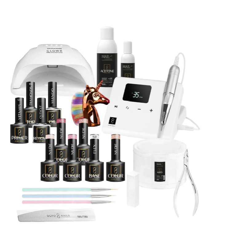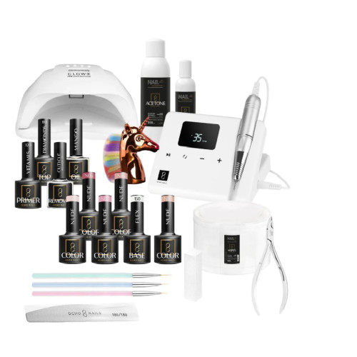 De set bevat de essentiële producten voor nagelstyling. Het bevat hybride lakken, vloeistoffen en preparaten, evenals accessoires. Daarnaast wordt de set gecompleteerd met een professionele lamp voor het uitharden van hybride nagels en een nagelfrees.