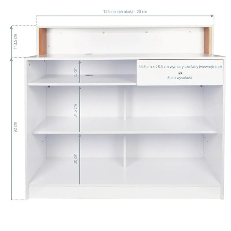 Voor optimaal gebruiksgemak beschikt de balie over drie open planken van verschillende afmetingen,