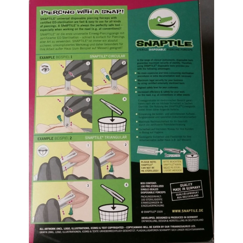The SNAPTILE® pliers are the first disposable and all-purpose piercing forceps with certified EO-sterilisation - the perfect tool for any professional piercer.