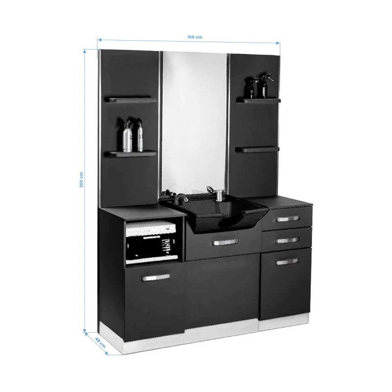 Een grote spiegel, zwarte wastafel en lades zorgen voor functionaliteit, terwijl het geheel een hoogwaardige afwerking heeft.