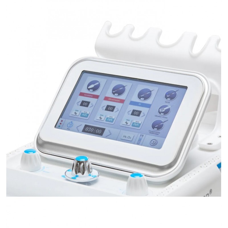 Het belangrijkste element van het apparaat is het touchscreen, dat zorgt voor gebruiksgemak. De mogelijkheid om behandelingsparameters en verschillende opties aan te passen, zoals het selecteren van het type, de intensiteit, de behandeltijd of de behandelgolfmodus, maken het mogelijk om het apparaat af te stemmen op de specifieke behoeften van de klant. Het gemakkelijk af te lezen display maakt het gemakkelijker om de voortgang van de behandeling te volgen, wat het gebruik van de combinatie nog comfortabeler en effectiever maakt.